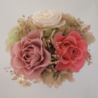 【花材】プリザーブフラワー・・・プロヴァンスローズキュートゼラニウム/ビビアンモーブピンク/アジサイグリーンロゼ/カスミ草ゴールド
