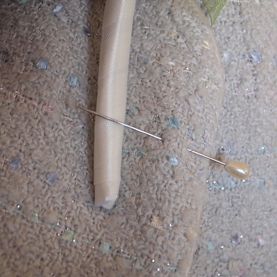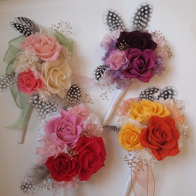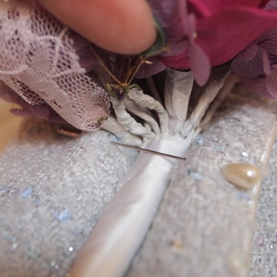 コサージュピンを使うタイプですので、洋服との安定感に優れています。(写真参照)