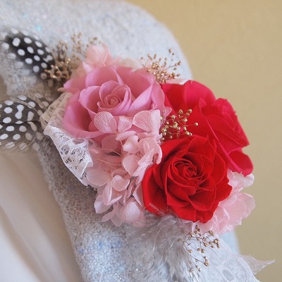 【花材】プリザーブドフラワー:プロヴァンスローズギュラーサンシャインルージュピンク・ローズピンク/プロヴァンスローズキュートレッド/ピラミッドアジサイオフベビーピンク/カスミ草ゴールド