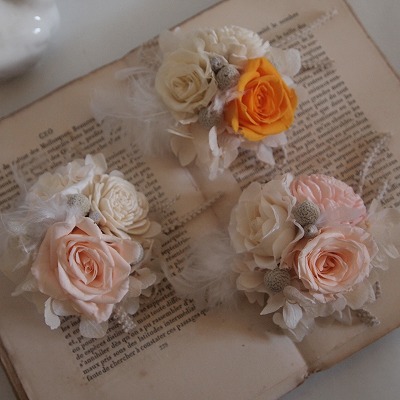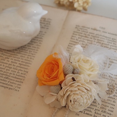 どのようなタイプのお洋服にもよく似合う、ナチュラルカラーのかわいらしいコサージュです。