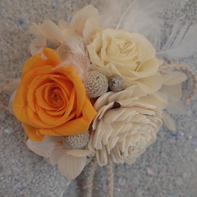【花材】プリザーブドフラワー:ローズいずみジュリアオレンジ/プロヴァンスローズシャンパン/ソフトゆめアジサイオフホワイト/ブルニア