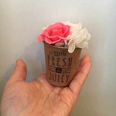 英字入りのナチュラルカラーのペーパーカップに様々な色の組み合わせで、小さなアレンジメントをしました。