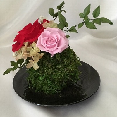 本来の苔玉は水が欠かさず必要ですが、プリザーブソドフラワーのアレンジと乾燥苔を使用しているので、お手入れが一切必要ありません。