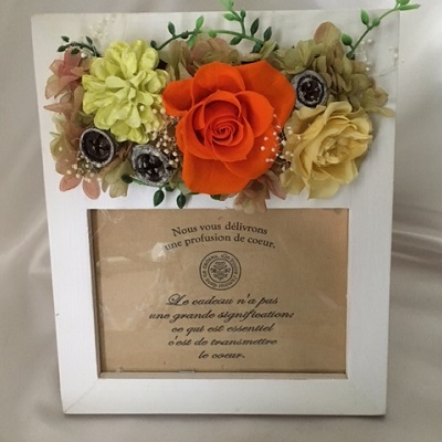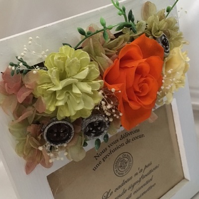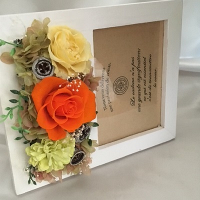 素材は木製で温かみのあるナチュラルなフレームに、ビタミンカラーがきれいなプリザーブドフラワーを使用しました。